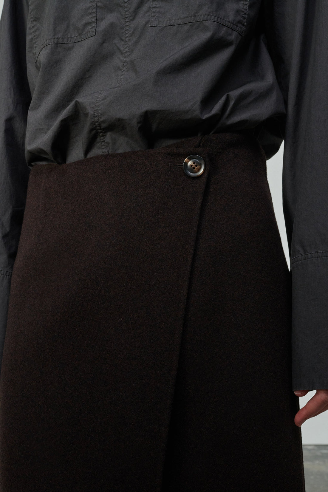Asymmetrical double-sided wool wrap skirt mottled brown