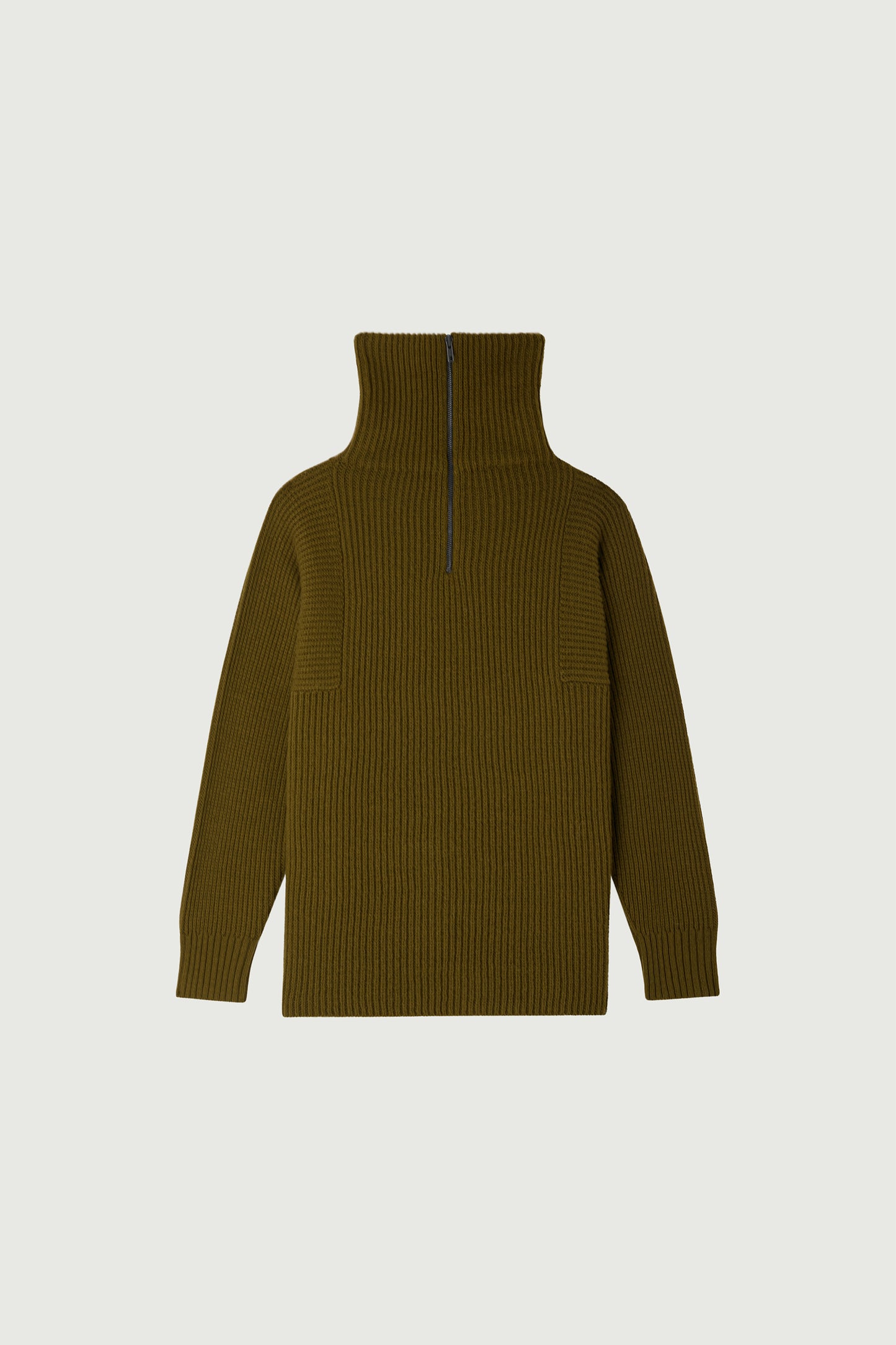 VISBY is a trucker collar jumper inspired by menswear, crafted in merino wool. It features a high zipped collar that can be worn open or up, along with a ribbed knit texture that adds depth to its khaki green colour. Its cut is intentionally oversized, with two side slits adding a twist to the design.